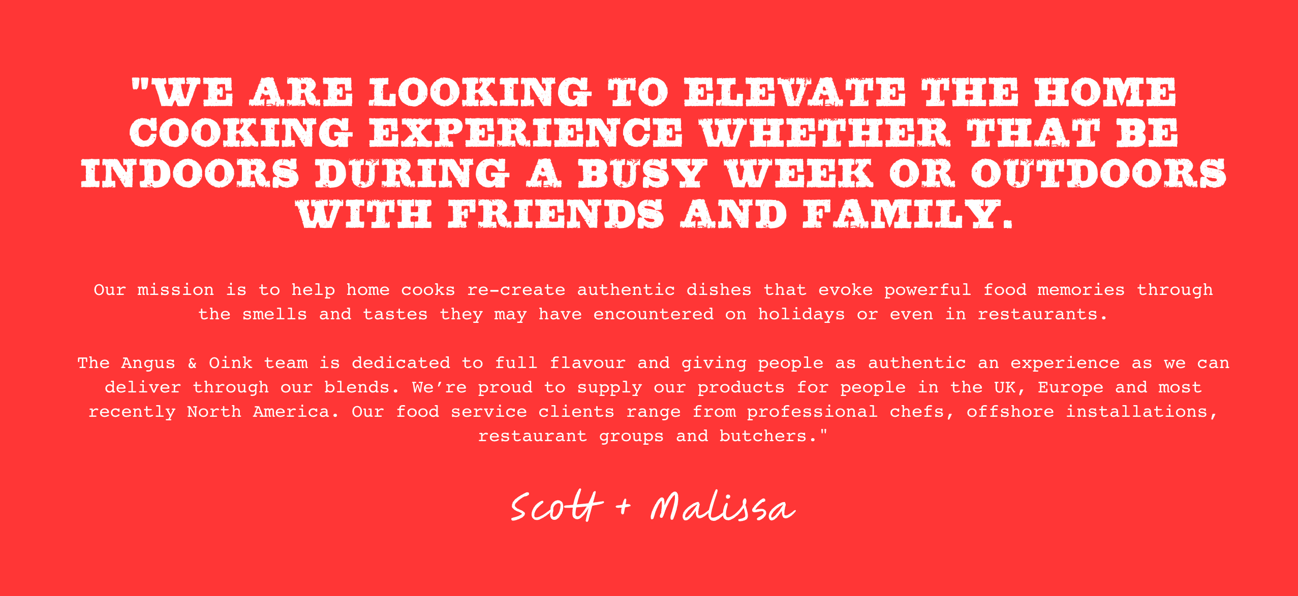 Our journey began with founders Scott and Malissa, who spent years exploring the culinary landscapes of South America, the Middle East, Asia, and Europe. Their travels ignited a love for fire-cooking and the vibrant tastes of world cuisines, leading to the creation of Angus & Oink in 2014. Starting from humble roots in a cowshed in Aberdeenshire, we've since grown into a flavor revolution, crafting innovative spice blends, sauces, and seasonings that bring the world’s best tastes straight to your table.